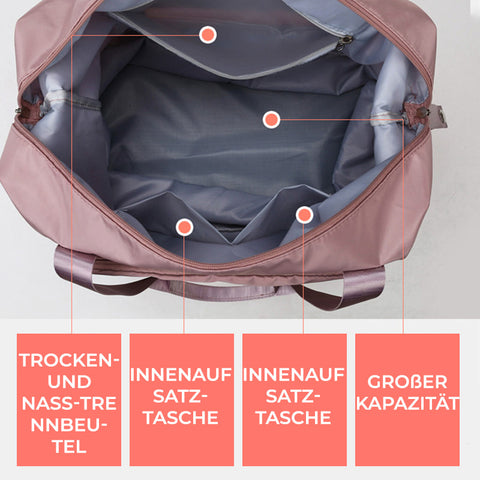 Darüber hinaus kann sein großes Fassungsvermögen und sein Multi-Taschen-Design alle Reiseanforderungen erfüllen und Gegenstände besser verwalten. Der Nass-Trocken-Trennbeutel kann auch verschwitzte Kleidung und Handtücher aufnehmen.