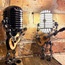 A cool metal microphone with a glowing LED light and a guitar, giving it a cyberpunk look. Great lamp for office work, studio, and garage decor. The robot is handcrafted and has a cyborg look.